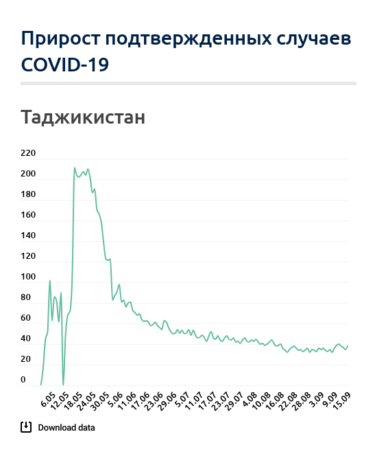 Коронавирус в Таджикистане официально наступил 30 апреля, когда правительство, до того отрицавшее наличие инфицированных в стране, накануне приезда экспертной миссии ВОЗ подтвердило первые 15 случаев. С тех пор количество случаев в Таджикистане достигло 9 тыс, что является самым низким уровнем среди стран Центральной Азии и почти в пять раз меньше, чем в соседнем и сопоставимом по населению Кыргызстане. Кроме того, если смотреть на официальный график, то обнаружится, что правительство справилось с эпидемией буквально за несколько недель: с начала лета количество ежедневных новых случаев в Таджикистане не превышает 100, а с конца июля не превышает 50. Но действительно ли о коронавирусе в Таджикистане можно говорить в прошедшем времени?