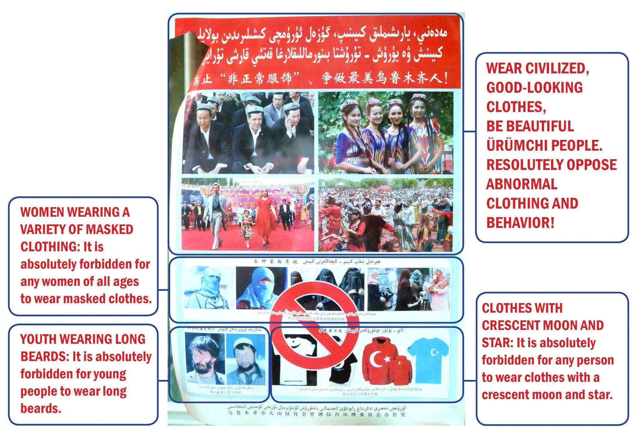 Плакат в Урумчи в 2014 году, который запрещает все формы исламского выражения, которые китайское государство считает «экстремистскими»