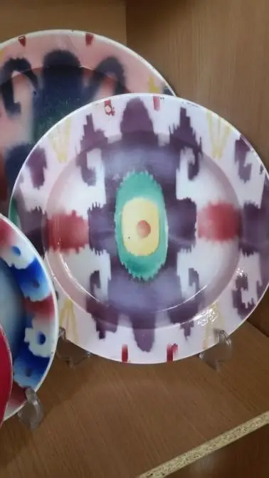 Общее название декора тканей и керамики – абри – позволяет предполагать, что вибрации красок на посуде изначально были инспирированы узорами тканей. Одновременно в случае и с тканями, и с керамикой наблюдаются параллели между среднеазиатскими изделиями и изделиями из Юго-Восточной и Восточной Азии, что вполне объяснимо контактами на трассах Шелкового пути.