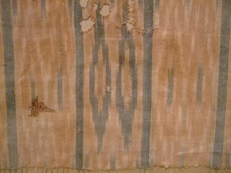 Первые века ислама дают нам значительно большее количество образцов тканей в стиле вибрирующих «перьевых облаков», уже из хлопка, производства Йемена (династия Зиядидов). Весь сохранившийся материал датируется концом IX – началом X вв., но это не исключает, что такого рода ткани и технология существовали у арабов и раньше. По-арабски их называли асб (от глагола асаба – перевязывать)[5]. Так, в экспозиции Метрополитен-музея (США) представлен фрагмент шали с тонкой бахромой из крученых нитей на концах и прорисованной черным пигментом и золотом, ближе к краю изделия, надписью почерком куфи, включающей слово бисмилла. Ткани с надписями были известны как тираз, а мастерские, где они изготовлялись – дар ат-тираз. Декор – повторяющиеся парные ромбы, расположенные в узких равномерных полосах вдоль полотнища, отделенных друг от друга линиями цвета индиго. Колористическая гамма строится на чередовании перетекающих друг в друга индиго и карминно-красного; цвета значительно выцвели со временем.