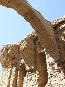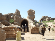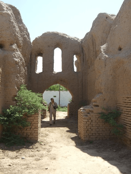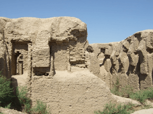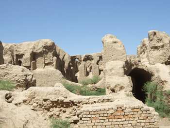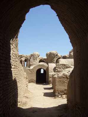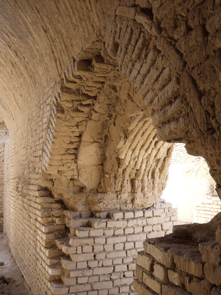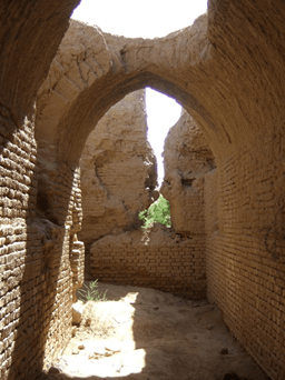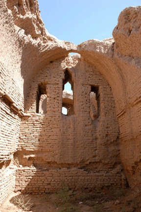 Наконец, самое интересное, что вся эта своеобразная красота возведена из самого что ни на есть простейшего сырцового кирпича с примесью самана, скрепленного лессовым раствором, а стены без затей отштукатурены глиной. Жженый кирпич встречается лишь частично, в арочных перекрытиях. Для укрепления стен и оконных проемов было использовано дерево. Декор в интерьерах либо отсутствовал вовсе, либо не сохранился.