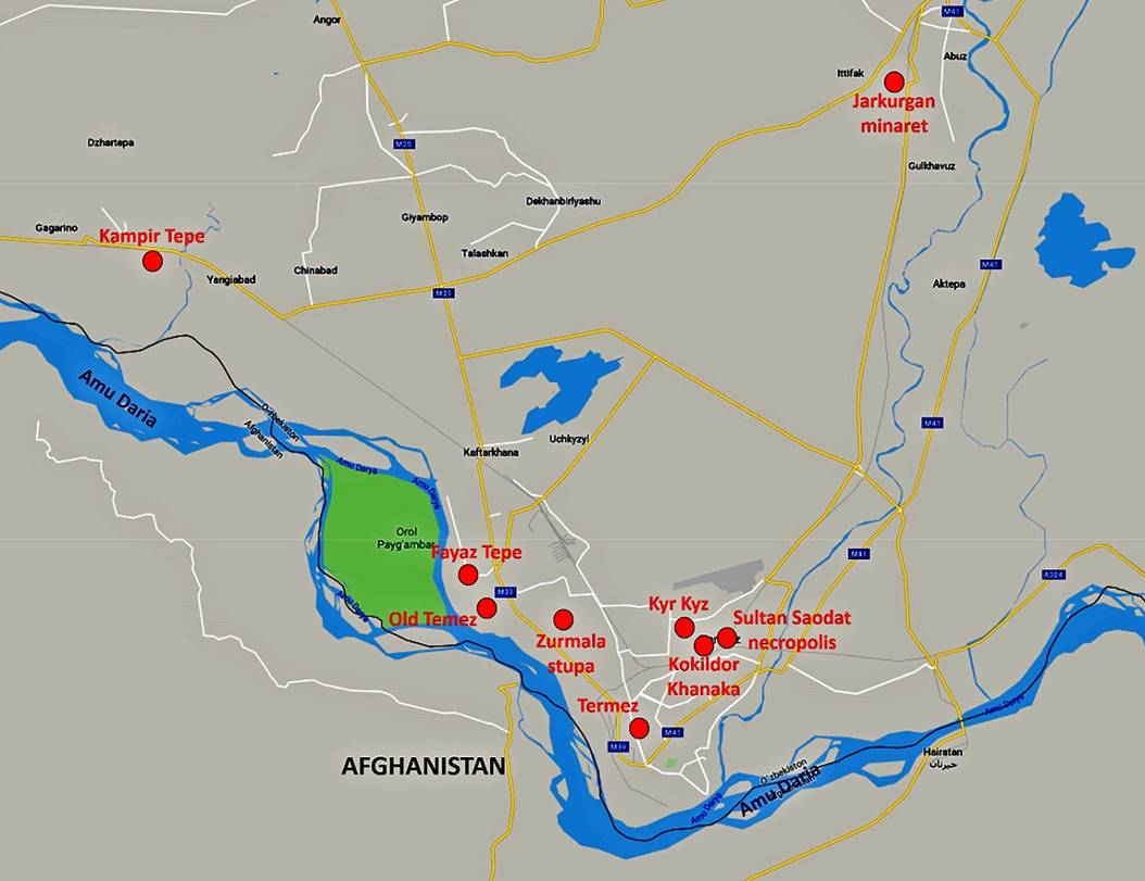 Термез – город в самой южной части Узбекистана недалеко от пограничного пункта Хайратан в Афганистане. В древние времена служил важным переходом на реке Амударья. С 9 по 12 века Термез был крупным городом и культурным центром и был знаменит своими торговыми лавками и ремеслами. В 1220 году после двухдневной осады город был разрушен войсками Чингисхана.