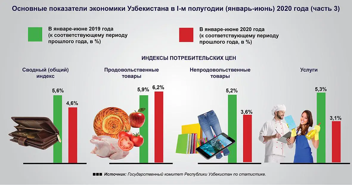 На этом бюджетные возможности Узбекистана ограничиваются. Основной «удар» коронавируса на экономику стран заключается в сокращении спроса на товары и услуги – как внутреннего, так и внешнего (внешней торговли). Внешняя торговля Узбекистана уже сократилась почти на 20% (за первые 7 месяцев этого года). Экспорт снизился на 21,3%, а импорт на 17,7 %. При этом главным экспортным товаром по-прежнему остается золото, цены на которое бьют мировые рекорды. То есть увеличение цен на золото не компенсировало потери внешней торговли из-за сокращения спроса по всему миру. Снижение экспортных доходов и других валютных притоков продолжает усиливать курс доллара в стране и ускоряет инфляцию. Хотя сезонное снижение продуктов питания и некоторая стабилизация эпидемиологической ситуации некоторым образом облегчили тревоги узбекистанцев, в среднесрочной перспективе будущее остается неясным. Восстановление внутреннего спроса – трудная задача на фоне потери работ и доходов предпринимателей.