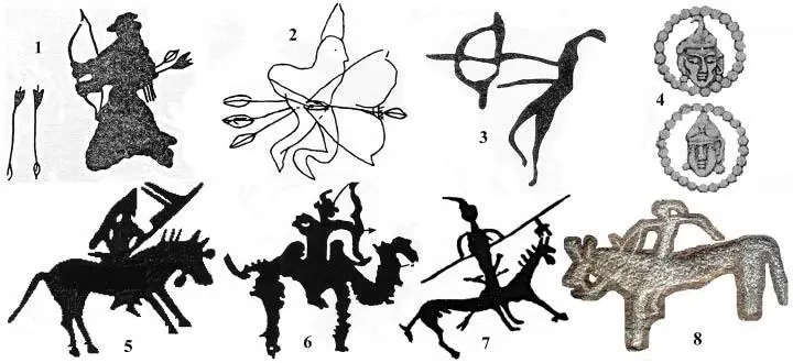 Первое отличие между изображениями на петроглифах и изображениями на монетах, фресках и артефактов из захоронений – акцент на головных уборах. Особое значение имели вариации головных уборов и причесок (по поверьям – вместилища души). Наиболее популярным был конусообразный головной убор: с высокой тульей (Цагаан-Салаа IV, Монголия; Джетысу/Семиречье, Казахстан; Северная Тува) и с низкой (от Джетысу до средней Сырдарьинской области) – см. рис. 1.2-3. Иногда (от Джетысу до средней Сырдарьи) нижняя кромка подворачивалась вверх (рис. 1.4). Изготавливались такие головные уборы как из плотного войлока, так и из более мягкого. Другой широко распространенный головной убор имел отвороты, специально для защиты ушей в холодные зимние дни. Отвороты обычно изображались как выступающие наружу с обеих сторон (рис .2). Изображения этих головных уборов были обнаружены в районе Туэкты, на Русском Алтае, в Туве, в Элте-Кижиге и в Жетысу.