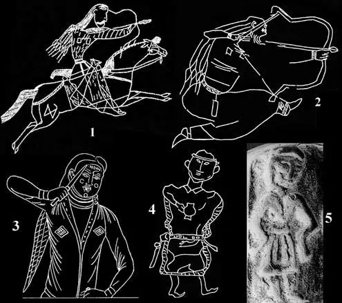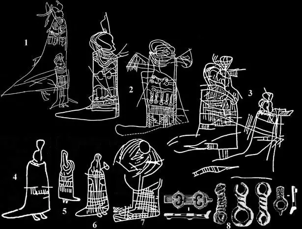 Что касается одежды, то лишь в редких случаях крой подчеркивался линиями на кафтанах и штанах, как в Эшкиольмесе, Джетысу (рис. 6.6) или только на штанах (Тарское, Северная Осетия) (рис. 3.2). Верхняя одежда с длинными рукавами (вероятно, с боковыми разрезами) обычно встречается на изображениях идущих персонажей, иногда имеется глубокий запах (рис. 6.5). Часто встречаются длинные накидки, которые носили, перекинув через плечи, короткие кафтаны (рис. 6.4). Детально выступают растительные или геометрические узоры, линия талии (как правило, узкая) подчеркивается поясом (Русский Алтай, включая р. Чаган, и Кыргызстан) (рис. 6.2,3 и 5); реже подчеркивается и линия плеч. Узкая талия подчеркнута у воинов скифского периода, в редких случаях (для простых людей) талия совсем не подчеркивается (рис. 5.5).
