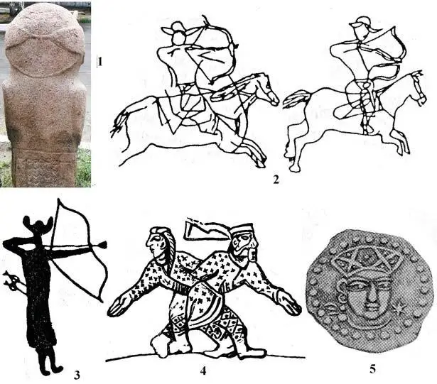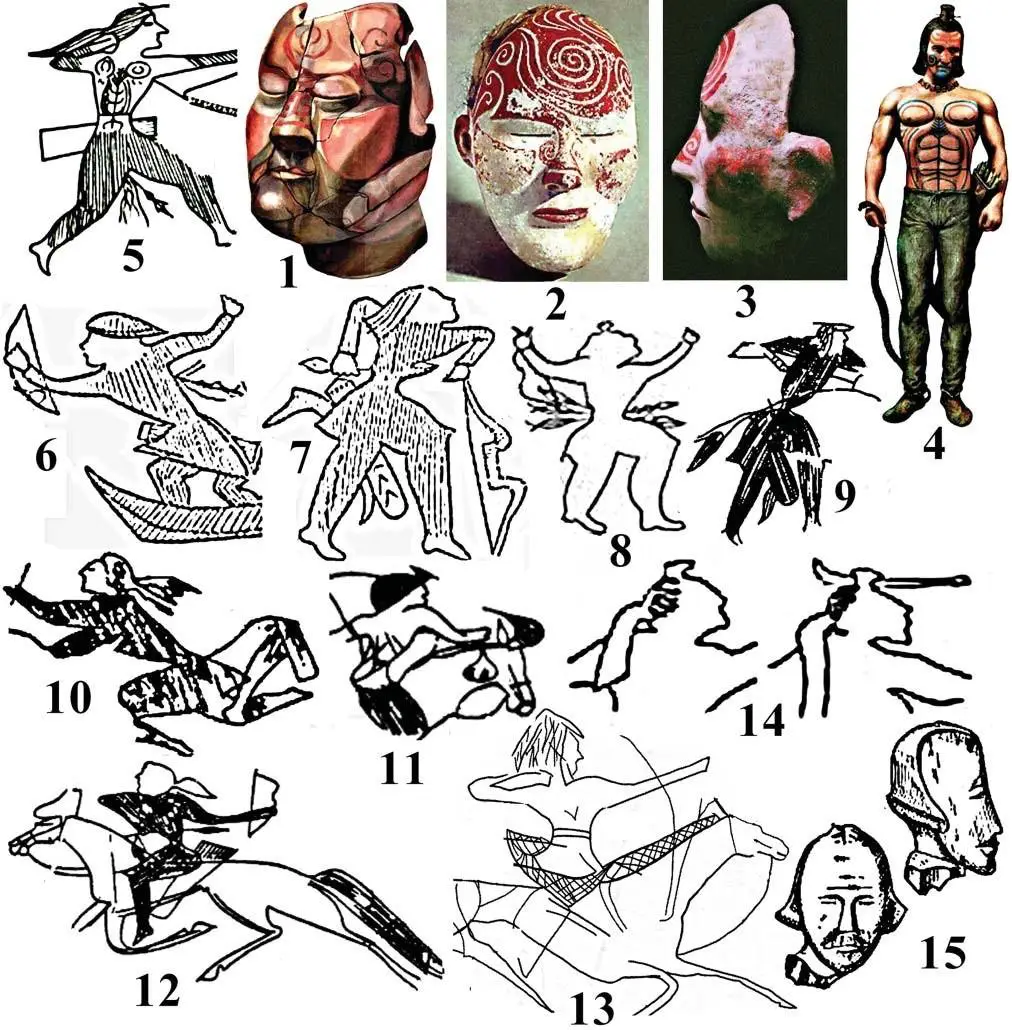 Примечательный головной убор представлен на тудуне Чача (рис. 4.2) – на заднем фоне изображена гротескная маска лысого старика с большим носом и длинной узкой бородой. Нумизматы из Ташкента полагают, что он напоминает шлем со слоном, который коронует греко-бактрийских правителей на соответствующих монетах. Головной убор воина-знаменосца украшен двумя длинными перьями (Эшкиольмес, Джетысу) (рис. 4.8). Иногда, для исполнения специальных ритуалов обнаженные мужчины надевали маски волков, священных тотемных животных для тюрков, о чем свидетельствуют книга Чжоу Шу и Бугутская стела, а также другие более поздние материалы (петроглифы из Жунгылшека I, средняя Сырдарья) (рис. 4.9).