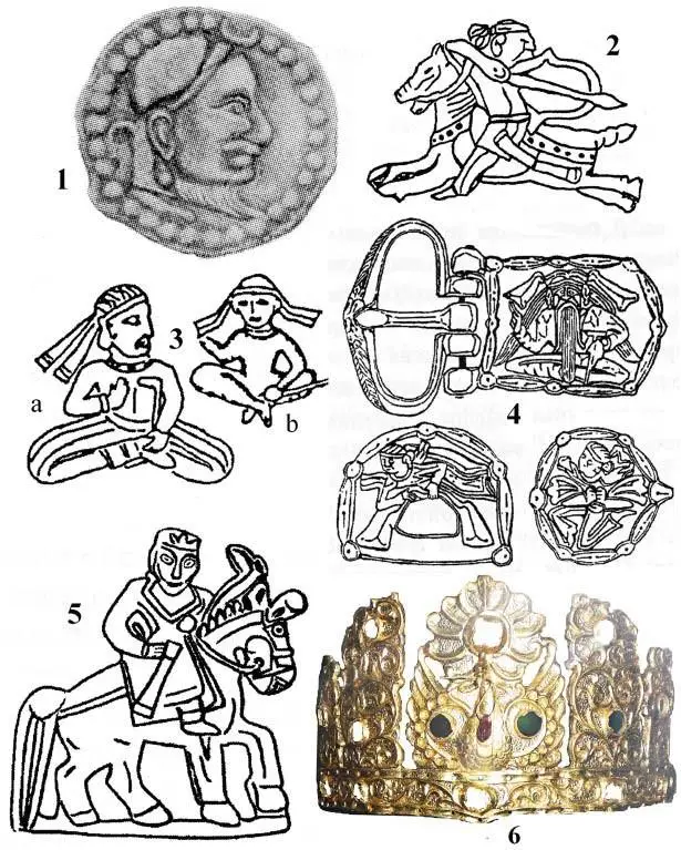 Знатные женщины носили головные уборы (с тремя крупными выступающими частями), напоминающими узкую диадему (Богиня Умай в Кудырже); по всей вероятности, скромная высота головного убора объясняется схематичным характером изображения. Известны и более массивные головные уборы конусообразной формы с тремя выступами и отворотом (на монетах Чача) (рис. 9.4). Более детальные изображения этого головного убора с такими заострёнными “рогами” могут быть украшены зубцеобразной полоской. На изображении Умай (а также ее подобия из Суттуу-Булак) подчеркнуты узкие соединенные брови и овальное лицо (рис. 9.1). На ковше из Коцкого Городка (рис. 9.5) вероятно изображена женщина-воительница, с короткими косами, заправленными под воротник кафтана, одежда воительницы ничем не отличается от мужской и гендерная принадлежность определяется исключительно косами[1]. Ключевым атрибутом женщины из правящей династии, вероятно, было золотое ожерелье с подвеской в нижней части (рис. 9.4). Умай из Кудырги, кажется, предпочитает высокие сапоги с опущенными носками.