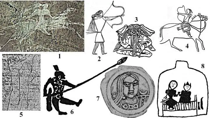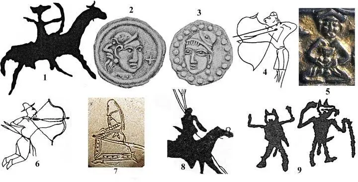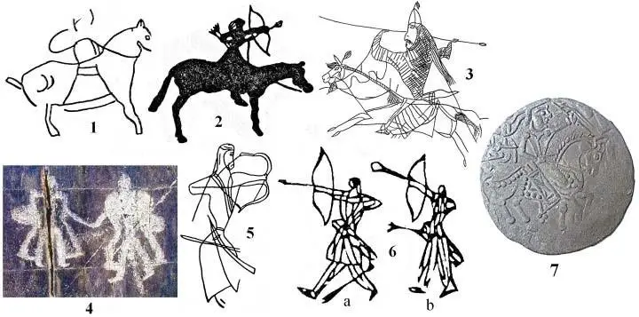Другие вариации известны по единичным изображениям (рис.4): широкополая шляпа (Цагаан-Салаа IV; Кургак, Русский Алтай) (рис. 4.1, 6), узкополая (монеты Чача) (рис. 4.3), шапочка из четырех клиньев (Кыргызстан; Жевакино, Казахстанский Алтай) (рис. 4.4, 5), головной убор с широким отворотом на затылке и отверстиями для косичек (костяной артефакт из Хирлеца в Западной Болгарии) (рис. 4.7).