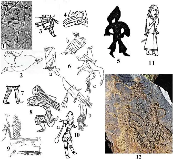 Встречаются изображения стеганых штанов, подобные тем, что найдены в курганах Пазырыка (Алтай) (рис. 5.2). Обувь представлена высокими сапогами и башмаками (рис. 8). В отличие от изваяний и настенных росписей, встречается очень мало достоверных изображений высоких сапог на петроглифах. На китайских изображениях ранних тюрков более престижными кажутся башмаки. Башмаки с длинными чулками бытовали на Алтае (Абаджай у р. Чаган) (рис. 8.10). В хазарском погребении Таловый II представлены башмаки с узкими заостренными носами; у всадника из Монголии (Цагаан-Салаа IV) длина носков башмаков достигала 30 см (рис. 4.1).