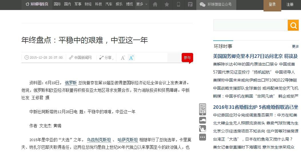 Популярная газета “Huanqiu shibao” в материале «Центральная Азия за один год – трудности посреди стабильности (平稳中的艰难,中亚这一年) подводит итоги ушедшего 2015 года. Прежде всего, издание отмечает в качестве важных событий региона президентские выборы в Узбекистане и Казахстане, в результате которых президенты Каримов и Назарбаев вновь переизбрались на свои посты. Статья предостерегает, что после проведения выборов вопрос о передаче власти получил небольшую отсрочку и не был принципиально решен. Издание отмечает, что прошедший год был тяжелым для всех центральноазиатских стран, но особенно – для Казахстана, где в августе месяце 2015 г. власти провели 30-ти процентную девальвацию национальной валюты – тенге, а чуть позже объявили о переходе на свободное плавание валюты. В плане безопасности Центральная Азия стала намного уязвимее в уходящем году, пишет издание, отмечая, что южные границы Туркменистана оказались наиболее незащищёнными участками внешних центральноазиатских границ. С другой стороны, все большее количество выходцев из региона стали примыкать к международным террористическим сетям. ДАИШ в этом плане стал играть значимую роль в нарушении спокойствия в странах региона.