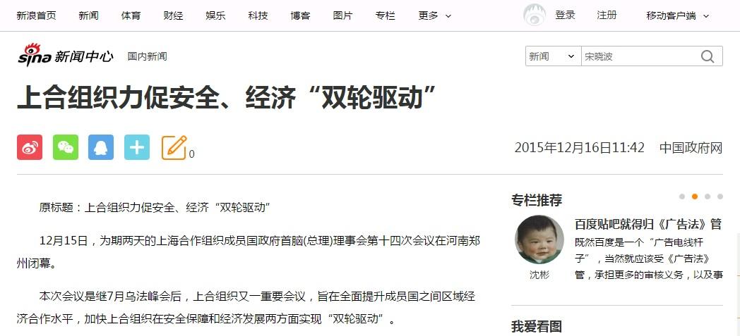 Какую роль в обеспечении безопасности региона может сыграть ШОС? В материале под заголовком «ШОС стимулирует развитие двух направлений: безопасности и экономики» (上合组织力促安全、经济“双轮驱动) приводятся итоги встречи глав правительств государств-членов ШОС, прошедшей в середине декабря в Пекине. Встреча в этом формате, как отмечается в публикации, стала важным этапом по подготовке предстоящего саммита глав государств ШОС в Ташкенте летом этого года. Содержание статьи наглядно демонстрирует возрастание значимости вопросов безопасности для Китая в рамках деятельности организации. Премьер Госсовета КНР Ли Кэцян сделал особый акцент в своем выступлении важности подписания Конвенции ШОС по борьбе с экстремизмом, вопросам противодействия наркотрафика и урегулированию ситуации в Афганистане. Говоря о торгово-экономическом взаимодействии в рамках ШОС, авторы замечают важность дальнейшей реализации инициативы Экономического пояса Шелкового пути. Китайский премьер отметил, что в настоящее время изучаются механизмы реализации идеи превращения Центральной Азии инфраструктурный и транспортно-логистический хаб.