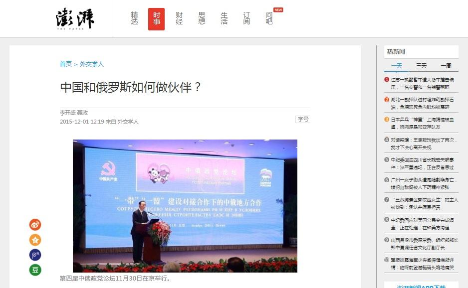 О будущем взаимоотношений России и Китая – издание «Thepaper» в большом материале под заголовком «Как Китай и Россия будут строить партнерство» (中国和俄罗斯如何做伙伴) рассказывает о факторах, сближающих позиции Москвы и Пекина на мировой арене. В нынешних условиях, когда Запад играет доминирующую роль в мире, тесное взаимодействие Китая и России – это важный вызов, особенно, в последние несколько лет, но китайские эксперты четко подчёркивают, что, несмотря на близость позиций КНР и РФ по ряду важных международных вопросов, а также углубление двустороннего сотрудничества, Россия и Китай имеют стратегическое партнерство, но не «альянс». Профессор Лю Цзюнь, директор Института международных отношений и регионального развития Восточно-Китайского педагогического университета подчеркивает, что КНР и РФ не создают некий альянс и не выступают против третьей стороны. Китайские аналитики также отмечают, что российско-китайские отношения остаются в системе современных международных отношений и ни в коем случае не инициируют создание параллельной или альтернативной системы международных отношений.