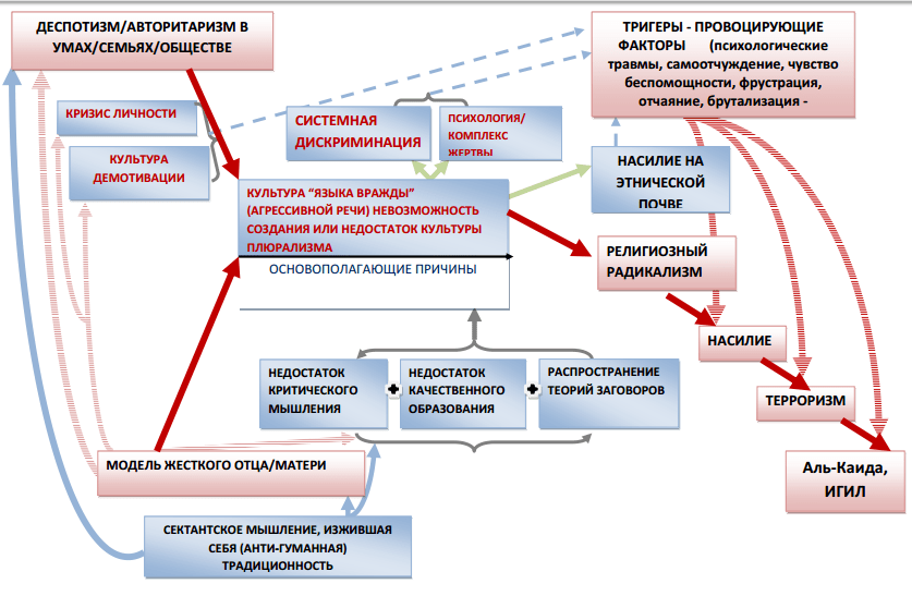 Если взять «культуру демотивации», являющуюся закономерным следствием модели “авторитарно-деспотичного” воспитания, то она служит благодатной почвой для последующего развития чувства фрустрации, глубокой депрессии, отчаяния, беспомощности, которые являются одними из инициирующих и способствующих факторов (триггеров) совершения насилия в отношении других людей и самого себя. Является фактом то, что яростные радикалы, в частности, террористы – это люди, которые не только ненавидят «других», они ненавидят «жизнь», им противна «жизнь» и многие из них верят в различные апокалиптические теории. Повторимся, такие факторы как чувство глубокого отчаяния, разочарования, беспомощности делают жизнь ненавистной и подталкивают человека к культу жестокости и насилия. Также следует учитывать и то, что почти во всех странах, где определенная часть мусульманской молодежи стала подвержена радикализму и насилию, помимо отмеченных выше причин, существовала «культура демотивации» на государственном уровне. Не было социальных лифтов, не было самого примитивного понятия верховенства закона, царила системная дискриминация и несправедливость, будь это Сирия, Саудовская Аравия, Ирак периода Саддама Хусейна и после него, Египет, Иран (список можно продолжить).