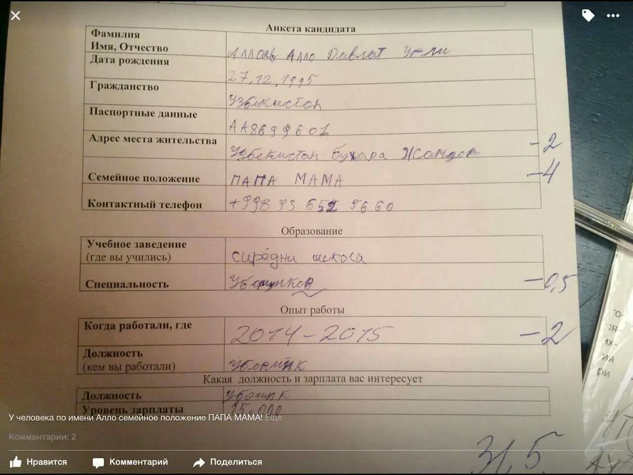 Для 21- летнего Алло Аллаева сдавать тесты – тяжелое испытание. Заполняя анкету в графе «семейное положение» он пишет прописными буквами: ПАПА, МАМА. Образование: СИРЕДНИ ШИКОЛА. Специальность – УБОШИК, то есть уборщик. Уровень зарплаты: 15000 рублей. Его ровеснику Расулу было еще сложнее. Он долго не смог заполнить графу «образование». Сильно краснел, тряслись руки, и когда подошел преподаватель, он сказал, что не сможет написать это. После того как экзаменатор объяснил, что нужно писать, Расул понял, что это слово означает образование, а не обрезание!