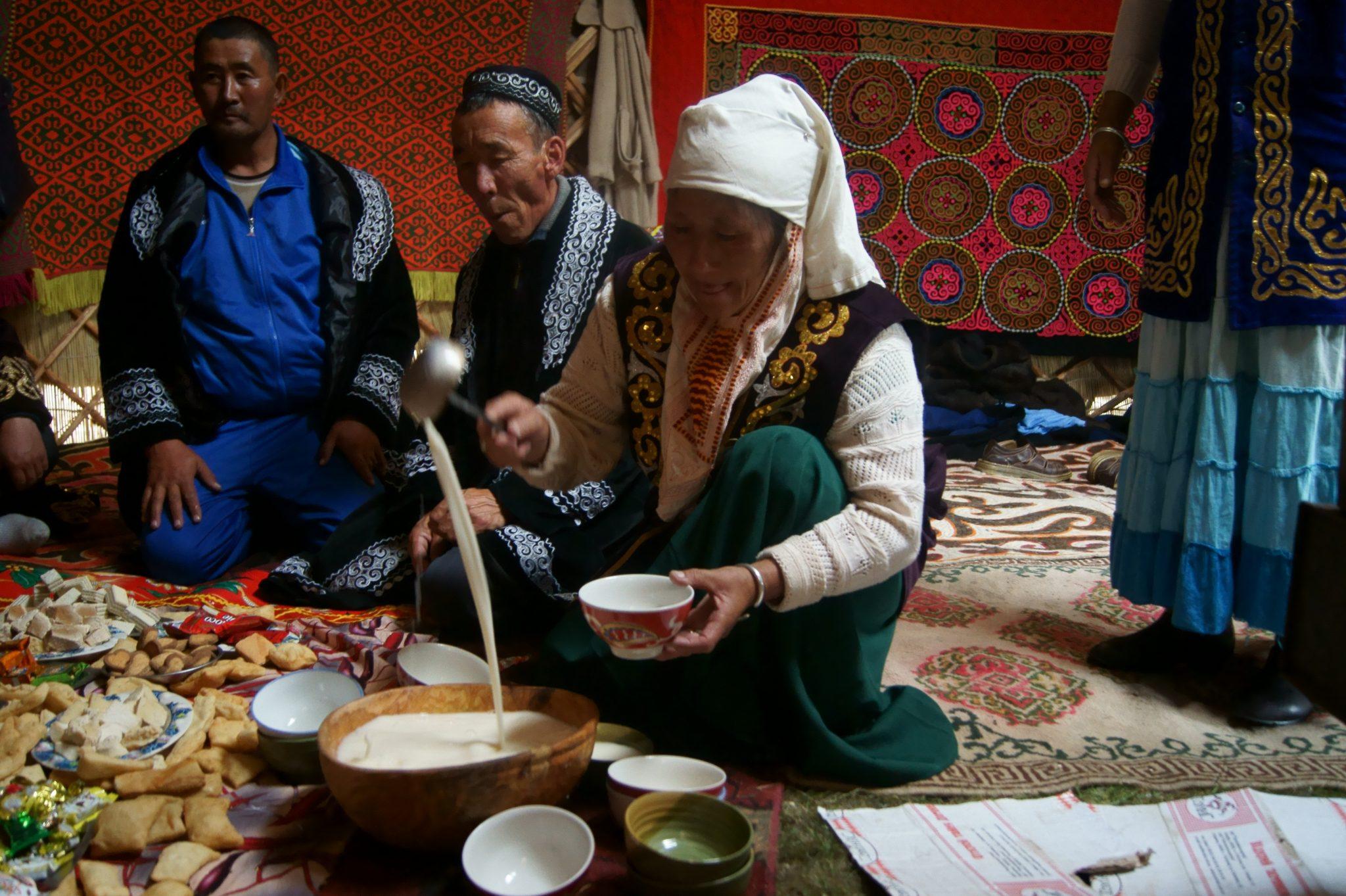 Казахи очень гордятся своим гостеприимством, теплотой и радушием, с которым они встречают гостей, родственников и незнакомцев. Гостеприимство является неотъемлемой частью казахской идентичности и, по мнению самих казахов, превосходит гостеприимство их соседей и извечных соперников – узбеков. Казахская женщина должна не только отлично готовить, но и создавать соответствующую атмосферу через непрерывный поток еды, напитков и развлекающей беседы. Грация, с которой женщина подает чай, к примеру, это источник гордости ее мужа, который наблюдает за всей операцией.