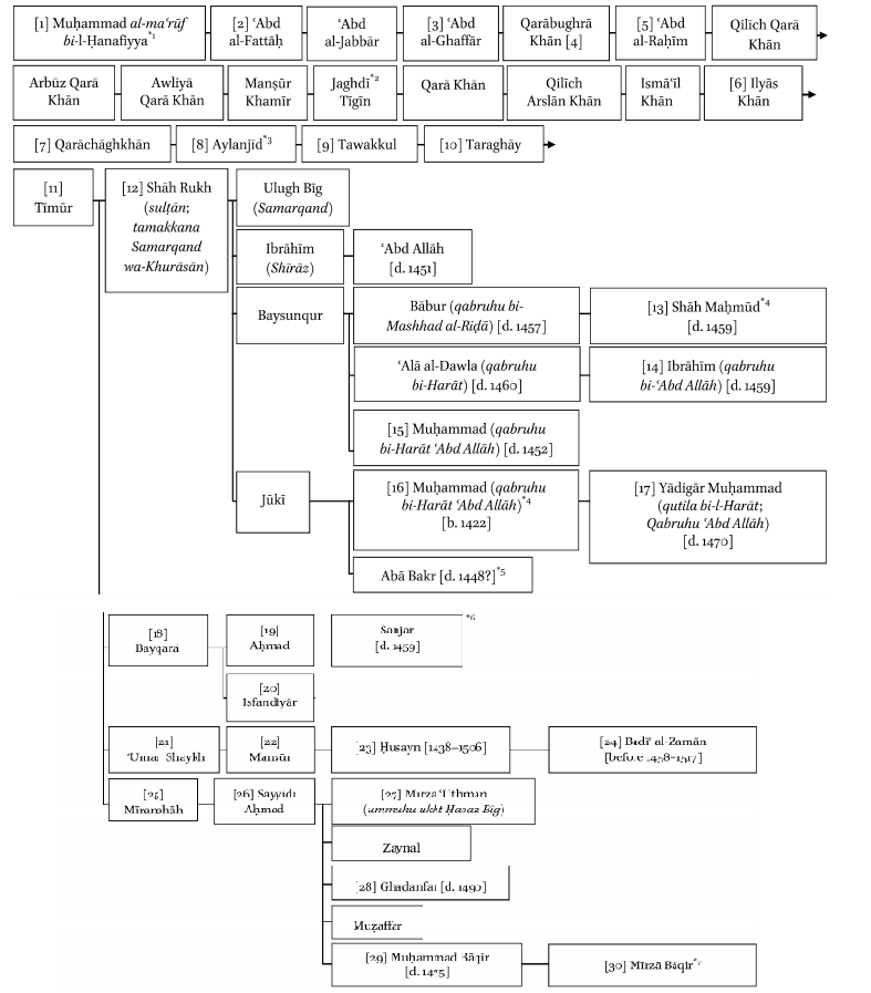 Мухаммад ал-ма руф би-л-ханафия—-Абд ал-Фатах—Абдуль-Гафар—-Карабугра Хан—Абд ал-Рахим—-Килич Кара хан—-Арбуз кара хан—-Авлия Кара Хан—Мансур хамир—Жахгди Тигин—-Кара хан—Кылыч арслан Хан—Исма ил хан—Илиас хан—Карачагхан—Айланжид—Таваккул—Тарагай—Тимур—Шахрух и т.д.