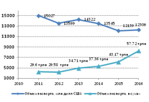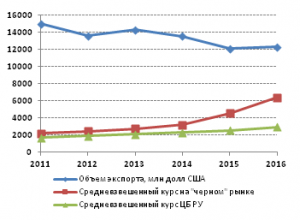 Как видно на графике, снижение объемов экспорта в долларах США с 2011 по 2016 годы сопровождалось обесценением узбекского сума по отношению к доллару США, причем, начиная с 2014 года, узбекский сум девальвировался более высокими темпами. Вполне резонно возникает вопрос: скомпенсировало ли обесценение узбекского сума снижение объемов экспорта, выраженного в долл. США? Для того чтобы ответить на этот вопрос, необходимо сопоставить объемы экспорта, выраженные в долл. США, с их эквивалентом в узбекских сумах, пересчитанных по определенному курсу. Отметим, что в Узбекистане установлены нормы обязательной продажи валютной выручки от экспорта товаров и услуг. Это означает, что экспортер обязан продать определенную часть валютной выручки по установленному центральным банком обменному курсу. В зависимости от вида товара, нормы обязательной продажи варьируются от 25% до 100%, но для подавляющего большинства товаров, сырья и услуг, она установлена в размере 50%. Таким образом, для расчета объемов экспорта, выраженного в сумах, принимаем такую упрощенную модель: усредненная норма обязательной продажи валютной выручки составляет 50%, и экспортер продал половину экспортной выручки по курсу ЦБ РУ, а оставшуюся половину продал по курсу «черного» рынка.